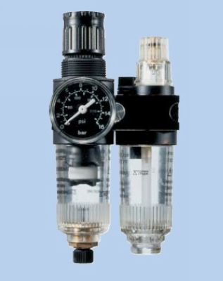 空气过滤器、减压阀和油雾器三大件以模块方式组合,结构紧凑,现代款式,最畅销的气动三联件;用于过滤空气杂质,油水分离,调节压力到实际使用压力,润滑油雾化润滑气动元件摩擦副。将压缩空气调节到气动执行元件(气动工具、气马达和气缸)所需要的状态;空气过滤滤芯有40μm和5μm两种,40μm(标准配置)适用于给气动执行元件供气,5μm适合汽车喷漆;调压范围0-16巴,透明塑料罐便于观察冷凝油水,进口压力超过16巴需要配备金属罐,冷凝分离油水半自动排放。